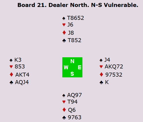 Portugal fant den gode kontrakten 6 grand mot damelaget vårt. med spar ut til esset, kunne man teste begge rødfargene. Etter å ha fått satt opp ett sparstikk, er det nemlig nok at ei av de røde fargene løser seg for fem stikk. Dessverre ble det tapsspill etter at Norge stoppet i 4 hjerter ved det andre bordet. 10 IMP ut.