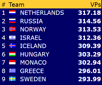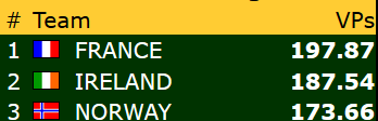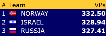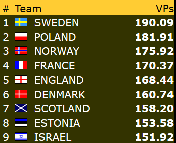 Veteranene gikk dessverre på sitt største tap så langt i turneringa med 10-38 mot mot Nederland. Dermed får de med seg 3,58 VP fra dagens andre kamp. Topp 3 i denne klassen ser slik ut: