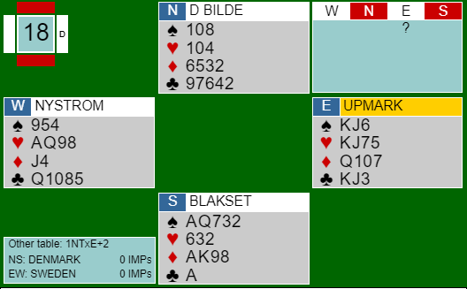 Sveriges nord passet altså ut 1 grand doblet, og syd spilte ut en liten spar. Siden det ikke fantes snev av inntak til nords hånd hadde Kasper Konow ingen problemer, og han endte opp med å vinne ett doblet overstikk, +380. Spillet ga 10 IMP til Danmark.