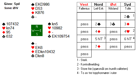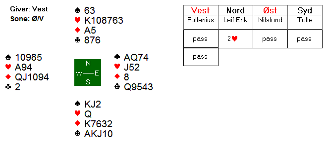 Leif-Erik vant stikket med kløver 10, men var låst i bordet og prøvde en ruter til esset. Øst stjal og fortsatt med kløver dame til stjeling i vest.