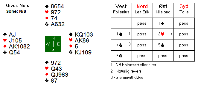 Tom viste en 18-19 hp jevn hånd og 3 kløver var et slags rele. 3 NT viste da 5- kort kløver uten annen 4- korts og Lars sleminviterte med 4 kløver. Det var et gullbud, kontrollmeldinger fulgte og på 5 ess Blackwood viste Lars ett ess. 5 ruter som spør om trumf dame ble benektet og ingen ekstra resurser. 6 kløver var de alene om, andre par stoppet i 3 NT. Da hjerter kom ut var det bare å stikke, og kl A fulgt av ny trumf til kongen var safevariant i tilfelle damen skulle bommes. Her stupte madamen og 13 stikk ble vunnet! I parturnering kan man sjanse på topper. En spiller i 3 NT fikk hj 10 ut til J, D og ess men satset så på at kl D satt i Nord. Da kl J ble stukket (etter kl A først så klart) var det duket for bare 9 stikk. Bunn.