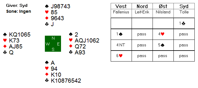 Spillet gikk heldigvis ut, da de meldte ut 6 hjerter på andre bordet også.