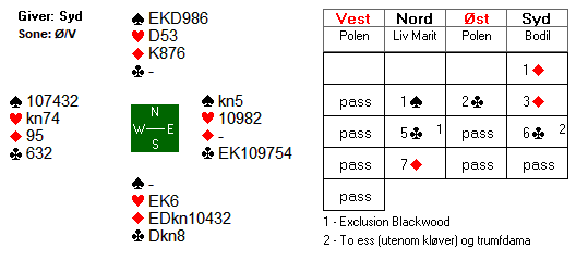 Spilleføringa var en ren formalitet. Etter trumfutspill fra vest kunne Bodil trekke ut trumfen i to runder og kreve alle stikkene. Polakkene fant også denne kontrakten ved det andre bordet.
