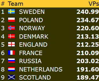 I åpen klasse vant Norge mot Danmark, og får med seg rundt 13 VP fra denne kampen.