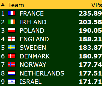 Onsdag kveld er registrert og bare 3 dager med spilling gjenstår før alt av ære, VM- kvalik m.m. er avklart. Så langt er Norge i tetskiktet i både åpen (4. plass), damer (3. plass) og Veteran (3. plass) og det er meget gode forhåpninger om å bli blant de 8 beste som går til VM- spill senere i år.