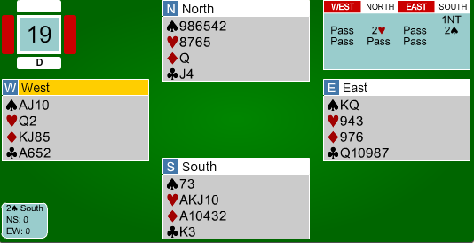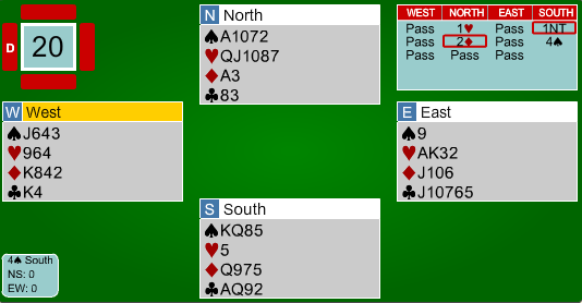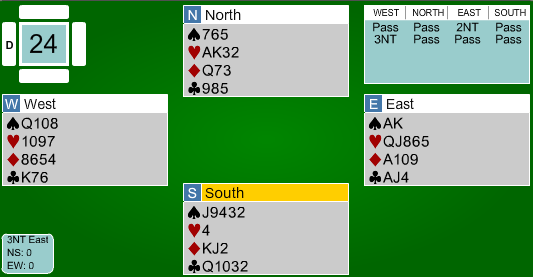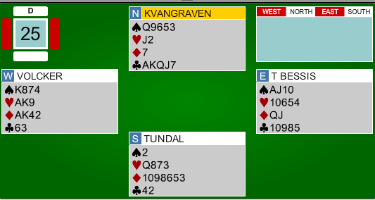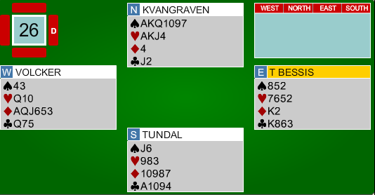 Franskmennene meldte seg opp i 3 grand på vests hånd. Nils hadde tidenes enkleste utspill, og innkasserte raskt fem kløverstikk og sikret beit i kontrakten før spillefører kunne kreve resten.