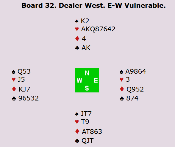 Dessverre var det de samme stikkene i grand-kontrakt, og franskmennene fikk faktisk meldt denne utgangen etter at Bessis oppvurderte østs hånd til en 20-21-NT. Volcker i vest tok seg ikke bryet å søle etter 5-kortsfarge i major hos makker. Han tenkte nok at veien ofte kan være kortere til ni stikk i grand enn ti stikk i majorkontrakt når han har ei trillrund hånd: