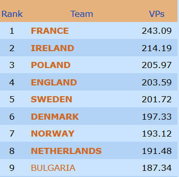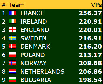 Etter ni stikk i 3 grand ble det 6 IMP til Frankrike.