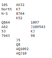 Vel, med hjerter ut er det ganske skummelt da hjerterstopperen ryker. Og om ruteren går kunne de jo like gjerne ha spilt slem! Det er i teorien enten en 5 ruterkontrakt, eller 6 grand. Men man vet jo ikke alle kortene på forhånd, så det er nokså naturlig å ende i 3 grand. Med hjerter ut og det viser seg å være en rutertaper vil 3 grand gå bet, men hva så, liksom. Makker og jeg hadde en meget svak turnering, og her spilte vi en 5 ruterkontrakt som skulle vise seg å være temmelig patetisk slden hele spillet så slik ut: