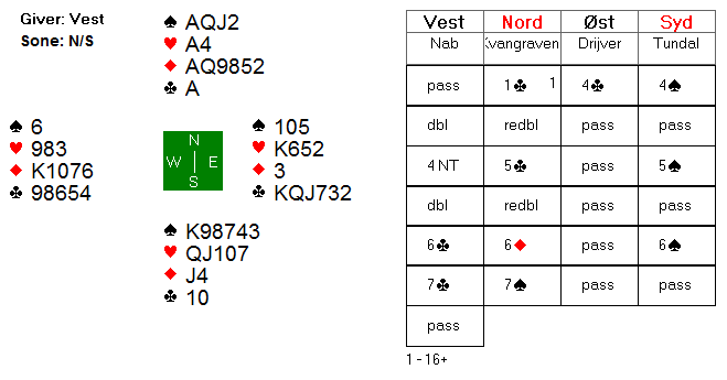 Mot Molander (Ø)- Lian (VS) åpnet Nord med 2 hjerter, svake 2, og Knut doblet opplysende. Syd passet merkelig nok (hadde 5- kort bra hjerterfarge) og May Liss hoppet til 3 grand, 12 hp+ og sikkert hold i hjerter. Da tok Knut sats og hoppet til 6 ruter! Bare ett par til kom så høyt, det var Hildur Rostad- Hanne Rostad med topp for 6 grand. Med den supre tilpasningen ble det 13 stikk. 7 NT og 7 spar vinnes også.