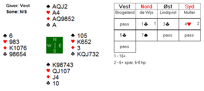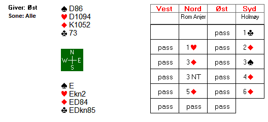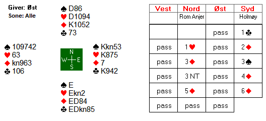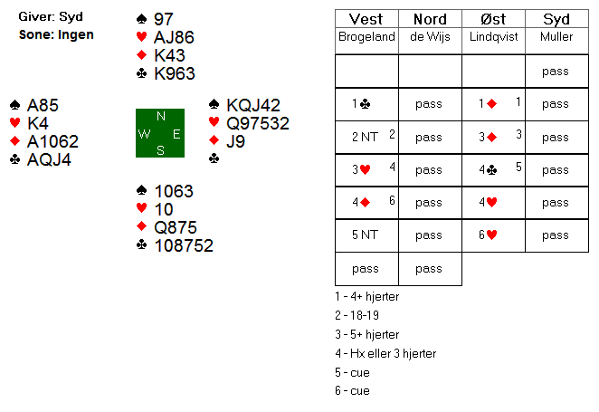 I lukket rom åpnet Lindkvist imed 2 kløver, Brogeland svarte 2 ruter og Øst gjenmeldte 3 kløver, fikk svar 3 ruter men på 3 NT inviterte Boye med 4 kløver og via kontroll 4 ruter ble 5 kløver løftet til lilleslem, 6 kløver. Her var hj AD beskyttet og 12 stikk bombesikert hjemme for +12 imp.