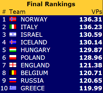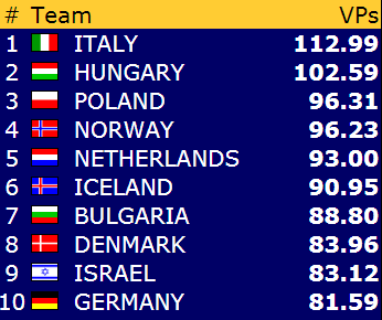 Norge stiller lag i åpen-, dame,- og veteran- klassene. Først ute var landslagene i åpen klasse som kl 10.00 onsdag6. st5artet full «Round Robin», alle mot alle over 11 dager, totalt 33 kamper pluss en walk over. Det møter nordmennene de sterkeste motstanderne på slutten, så det gjelder å sope inn mye mot de antatt svakere. 1. runde mot Hellas gikk ypperlig, allerede fra start var Nils Kvangraven (N)- Ulf Tundal (S) i åpent og Boye Brogeland (V)- Espen Lindkvist (Ø) i lukket kraftig på hugget. Hjemmeseier 60-0 imp var formidabel start. Ledelse allerede, men det er lang og krevende løp framover. Gl videre!