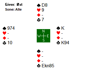 Arne Marthinussen og makker fant beste utgangskontrakt. Der passet Anne Langgård (N), Arne åpnet med 1 ruter, Herlov Langgård (S) gikk innpå med 1 hjerter og Vest krevde med 2 hjerter. Da Nord hoppet direkte til 4 hjerter tok Marthinussen med muligheten for sparkontrakt, og 4 spar fikk stå for 13 stikk. Mye bedre score enn utganger i ruter de fleste kom i.