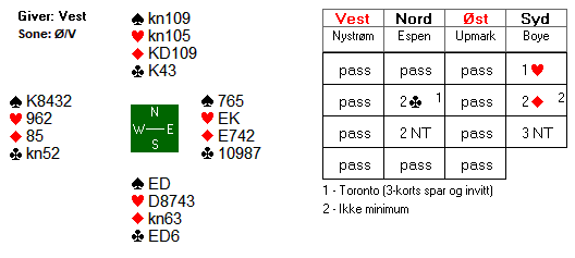 Da har Boye en overgang for lite på hånda til å stjele godt ruterstikk nummer to. Aktuelt stakk øst, og fortsatte med en hjerter. Boye vant med esset, og innkasserte ruter dame, før en ny ruter til stjeling fulgte. Da knekten kom på fra vest, var det tolvte stikket i havn.