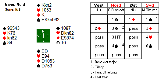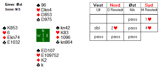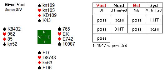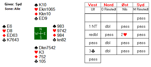 1 grand viste 14-16 hp. Nord satt bak med ei opplagt straffedobling, og han satt klar til å doble det meste. Ulfs redobling viser etter systemet begge minor. Nils var imidlertid ikke helt sikker på betydninga, og prøvde seg med 2 hjerter. Etter at nord doblet nok en gang, flyktet Ulf i 3 kløver. Etter å ha tenkt seg litt om, doblet Ola Rimstedt for tredje gang.