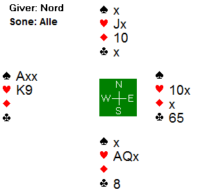 Jeg spilte ut ruter knekt til esset, og spillefører fortsatte med 3 høye rutere, der han hev 2 hjertere og makker 1 hjerter.