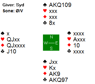 Jeg startet med 3 hjerterstikk og skiftet liten kløver til Sofies ess, som siden måtte få 2 ruterstikk til for +500 og en ren topp!