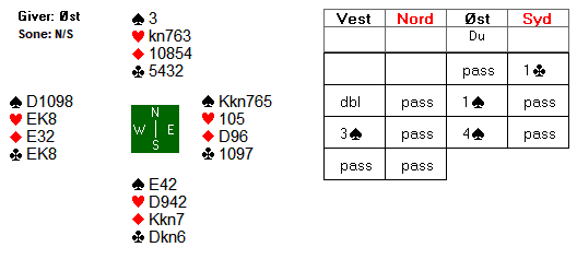 Bror Mikael i syd hadde lite å bidra med i motspill mot 2 spar, og tok ut i 2 grand, som trolig viste to steder å spille. Med trippelt sparhold og uten noen firekortsfarge, valgte Ola å passe ned 2 grand. Østs hadde til å doble, og det ble siste ord i meldingsforløpet.