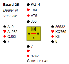 Flere steder havnet øst i 6 kløver etter at nord hadde meldt inn 2 eller 3 hjerter over vest sin 1 spar i åpning. Hjerter 9 kommer ut til esset. Det er to avkast i spar hos vest, og de brukes til å kaste østs hjertertaper og en ruter. Det blir fortsatt igjen A-Q-9 i ruter mot åtteren tredje, og den må løses for en taper.