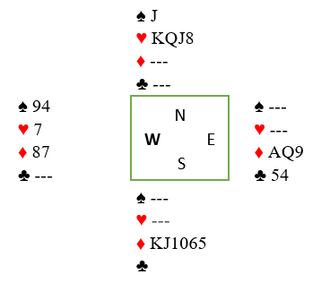 Etter å ha vunnet med hjerter ess spilles tre store kløver, tre store spar med hjerter- og ruteravkast. Så trumfes en hjerter, og dette er igjen: