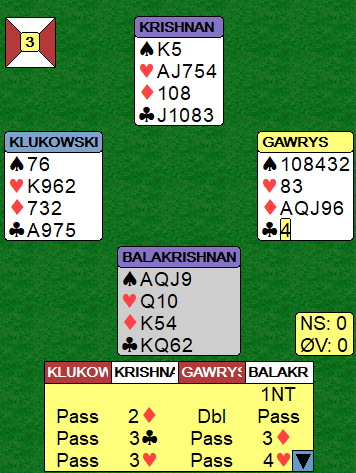 Nord spilte ut kløver og de tok to stikk der fulgt av en tredje kløver som ble stjålet høyt av vest. Han tok ut trumfen, og da det viste seg at nord hadde to trumf i tillegg til de to kløverne han hadde vist var resten barnemat for Klukowski, nord var den som måtte ha trekorts hjerter (hvis ikke har han syv ruter og ville ha åpnet med 3 ruter).