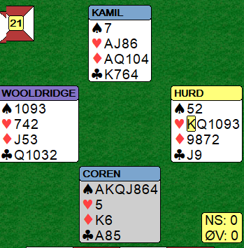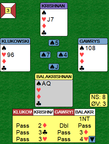 Antallet bet spilte egentlig ikke så stor rolle siden Klukowski (vest) var i 4 spar ved det andre bordet etter svake 2 ruter i åpning fra nord. Spillets utfall var avhengig av om Klukowski vant utgangen, eller ikke.