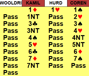 Ved det andre bordet valgte Gawrys å ikke åpne med 3 grand, antagelig nettopp pga. det argumentet om fin majortilpasning. Han startet med 2 kløver, naturlig melding (Polsk kløver). Syd spratt innpå med 3 ruter og Klukowski sa 3 spar, naturlig og krav. Nord hoppet til 5 ruter, Gawrys støttet med 5 spar og det kom pass fra syd. Klukowski kunne se makkeren var kort i ruter, og at øst ikke har mer enn maks ett honnørpoeng i spar. Alt som må dekkes opp av Gawrys åpningskort er vests to hjertere! Så storeslem må nesten ha meget gode sjanser, og han meldte 7 spar!