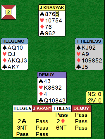 Som man ser står det 7 ruter og 7 kløver imot så «stampen» i 6 spar som bare kostet 3 doblete beter, -800ble billig. Man hadde i de to foregående spillene sett at Ø-V, spesielt Ø var forsiktig, og det spørs hva som ville skjedd om Øst hadde våget 7 ruter. -800 ga solide +20 i score mens -1100 ville gitt -18 og 2170 for 7 ruter ville gitt -23 for lederne. Bare 3 av 27 par var i storeslem, man får jo ikke meldt i fred!