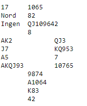 Men så kommer tilleggsopplysningen at du ikke får melde i fred! Ved flere bord åpnet nord med 3 ruter, og noen steder løftet syd til 4 ruter (eller kanskje meldte han en «morsom» 3 grand) før det ble vest sin tur. Da er det sannelig ikke lett.