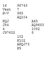 Ruter ess kom i utspill fulgt av spar 10 i skift. Blindemann vant det stikket, og nå ble det spilt kløver fra vest som nord stakk med esset. Nå blir det bet om nord skifter til trumf. Øst må ta for esset for å ha igjen to trumf til å stjele ruter med, men da får syd to trumfstikk med K-10 bak østs dame. Men nord trodde kanskje makkeren hadde singel spar og fortsatte med den fargen til østs ess. Så ruterstjeling, kløver til stjeling og nok en ruterstjeling. Begge ruterstjelingene ble tatt med små trumf, og så kunne han seile hjerter knekt rundt, og forsvaret kunne ikke få mer enn ett trumfstikk. Dermed ble det +620 til Ø/V ved det bordet, og utgang begge retninger ga lederlaget 14 IMP.