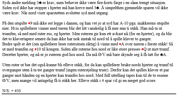 Merk det fine ruterspillet etter nieren ut hvor øst ikke legger i damen. Spillefører bør kunne se at alle nords rutere utenom kongen (J-8-7) på et vis har blitt like store. Så det er godt spilt å IKKE vinne med tieren i første stikk, men å stikke med esset. Så, etter uttrumfing spilles ruter 10 til kongen fulgt av stor ruter som presser ut damen mot trumf. Da får han/hun utnyttet ruterfargen og det blir det enkelt elleve stikk etter elegant spilleføring!