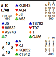 Stokkvik-Olsen var noen sekunder i 6 kløver, men Stokkvik tok ut den i 6 grand som Olsen skulle spille. Det viste seg å være klokt, for 6 kløver har ingen sjanser (der kan det bli to bet med ruter ess, ruterstjeling og enda ett trumfstikk til øst).