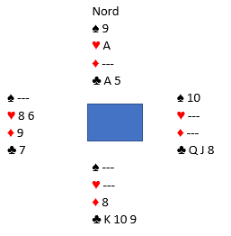 På nords siste hjerter som syd kaster ruter 8 på må øst kapitulere. Kaster øst spar står 10 spar 9, og kaster han kløver tar syd tre kløverstikk til slutt. Pent!