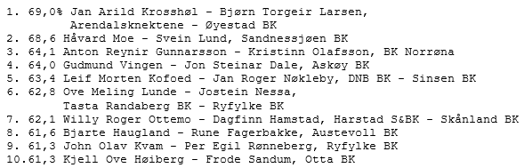 Da er tirsdagens resultater komplett med alle puljene. Det ble ingen endringer helt i toppen på den listen vi presenterte i går. Kun Sverre Selfors-Oddbjørn Handå, Mo/Båsmo snek seg in på topp-10 (10.plass) med 63,4%. Tirsdag deltok totalt 428 par.