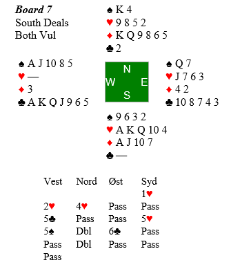 Resultatene varierte fra 5 kløver doblet Ø/V med to overstikk (må ha vært etter spar konge i utspill?) og +1150 den veien som Per Yngvar Hodnebrog-Camilla Stahl (Grimstad) noterte seg for, via en rekke forskjellige scorer til toppen N/S som var +2070 for 6 hjerter redoblet med hjemgang! Det var det Bjarte Haugland-Rune Fagerbakke (Austevoll) som fikk til. Men 2070 var bare akkurat nok til topp, for to par gikk som Ø/V syv doblede bet i 5 spar, +2000 til N/S!