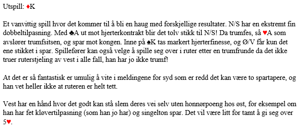 Dette stemte antagelig ikke så aller verst med det som skjedde rundt omkring. Ved seksten av 55 bord ble scoren +200 til N/S. Men det er klart at med slike kort skjer det litt av hvert!