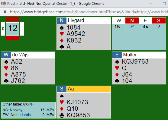 Om syd melder er det ikke sikkert at det norske paret finner toppkontrakten. Men det gjør vel antagelig det, for over 4 grand fra syd, 5 ruter fra nord og 5 hjerter fra syd, bør nord legge på.