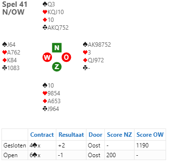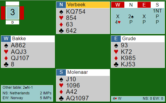 Her hadde N/S en nedlegg slem i hjerter, selv om de manglet to ess. Og siden vest har begge de essene, og øst normalt har meldt, er det ikke unaturlig at han dobler slem med +1660 til N/S som resultat.