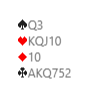 Her åpnet De Wijs med 1 grand som vest (9-12), og det var Livgård sin tur som nord. De norske spillerne vet jo at det er farlig å være for passive mot slike grandåpninger, men det kan være farlig å være for aktiv også. Nord har lyst til å melde inn, men skulle gjerne hatt en bedre farge, eller sekskorts farge for å melde i andre hånd i ugunstig. Øst kan jo ha veldig sterke kort og syd ingen ting. I så fall blir det fort et blodbad om nord melder inn. Nord passet.