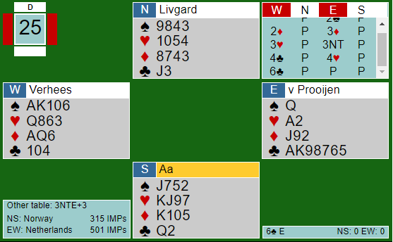 Da vest vant med spar konge og skiftet til hjerter 10 dekket Livgård med knekten og fikk hjerter ess på. Det kom nok en hjerter rett inn i K-9 saksen. Dermed hadde han ni sikre med to hjerterstikk, tre ruterstikk og fire kløverstikk. Etter å ha testet om ruteren gikk spilte han spar mot damen for overstikket, +630.
