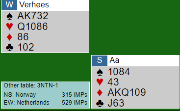 Der Ulf Tundal satt vest åpnet han i andre hånd med 1 spar! Stilen og systemet deres tillater tynne åpninger, spesielt med god farge, og her var det god hjelp slik at Kvangraven fant sparutspillet som faktisk er nokså drepende, om vest ikke prøver å være lur i motspillet (lur? vel hjerterskift kan jo være riktig). Tundal la styrke i første sparrunde, og nå kunne ikke kontrakten vinnes om ikke spillefører tar en sprek ruterfinesse over østs knekt fjerde. Det gjorde han ikke, og en bet ga stort gevinstspill for Norge.