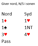 I hjerterkontrakt: Ruter knekt trumfes hos syd, trumfen tas ut og fem runder spar gir avkast for en kløver. Nords hånd blir god som gull, tretten stikk.