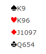 Etter å ha åpnet 1 kløver med dette gikk det 1 hjerter fra venstre, 1 spar fra makker og 2 grand fra høyre. 2 grand ble forklart som firekorts hjerterstøtte og en hyggelig hånd, normalt med rundt 10 poeng.