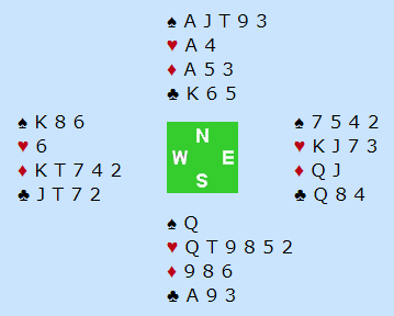 I 4 hjerter er det en bet om syd spiller ut kløver til esset, spar gjennom til syd som tar to stikk der og spiller en tredje spar.