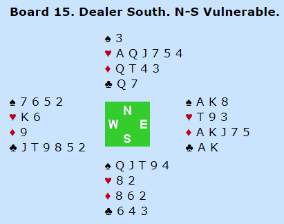 Marianne (øst) hørte nord åpne med 2 hjerter i 3.hånd, og det viste 8-11 hp med sekskorts farge. Marianne doblet, syd sa pass, og Christian meldte 2 spar. Da sa simpelthen øst 4 spar, en bra sats da det skal veldig lite til hos vest for at det står. Syd trodde ikke på denne kontrakten og doblet. Kontrakten er jo enkelt bet med ett hjerterstikk og tre trumftapere, men nord visste ikke hva som var riktig utspill. Han prøvde liten ruter. Da hadde Bakke fått den lillefingeren som gjorde at han kunne ta hele hånda; han tok ruterfinessen med knekten. Så to store ruter med avkast av to hjerter fra hånden. En hjerter ble stjålet, så kløver til øst og mer hjerter. Syd var sjanseløs og kunne ikke få mer enn de tre trumfstikkene. Han trumfet høyt og spilte trumf, men da var det bare å spille ruter. Selv om syd da kunne trumfe ble ruterkvisten godspilt i det stikket, og det var ti stikk, +590.