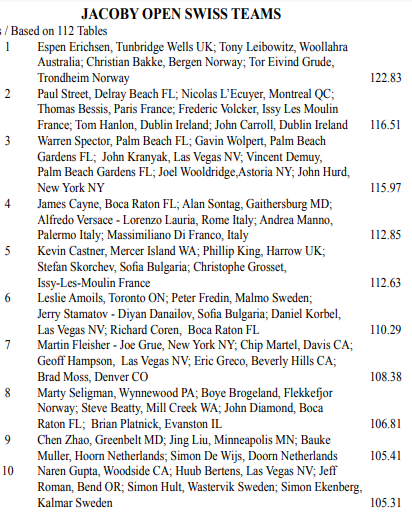 I går kveld ble det klart at NEDERLAND og LAVAZZA er de to lagene som fortsatt er "undeafeated" i A-bracketen, og de spiller i morgen tidlig om finaleplass. Vinneren fra den kampen er altså klar for finalen og får oversitt når de andre gjenværende lagene spiller sin siste kamp som handler om finaleplass. Den som vinner av Nederland og Lavazza får en fordel, de får hvile mens de andre spiller en kamp til, og de får 6.5 IMP carryover (ledelse) idet finalen starter.