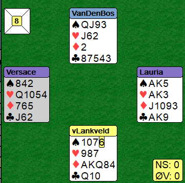 Nord kom inn. Sparen satt som ventet 4-3 fra start så nord kunne ikke ta mer enn to sparstikk i alt før han måtte spille kløver. Det betyr at nord fra start hadde fordelingen 4-3-1-5, noe som øker sjansen for at kløver dame er hos han sammen med fem kløver heller enn hos syd som hadde bare to kløver fra start. Idet kløveren kom fra nord la Lauria liten fra hånden, men da stakk syd med damen og kunne ta en bøtte med ruterstikk, to bet!