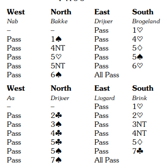 Dette er en glimrende slem spilt av nord. Kun en svært uheldig sits i trumf med alle tre trumfene bak nords hjerter beter 6 hjerter, eller at det sitter helt vilt og de får en stjeling i en farge. Spilleføringen var en formalitet, +980 til Norge.