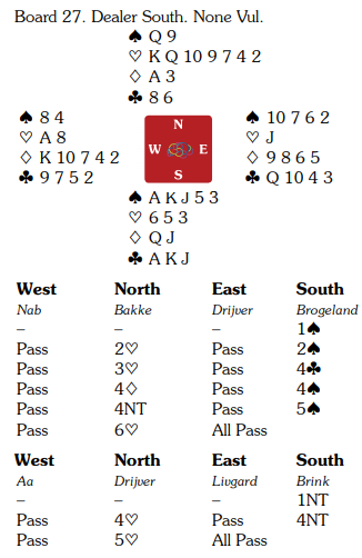 Det er svært overraskende å se at et makkerpar av Brink-Drijvers kaliber bommer i dette spillet, og det etter at de har meldt en for hard storeslem og gått bet i forrige spill! De stoppet altså i 5 hjerter, og dermed ga spillet 11 IMP til Norge.