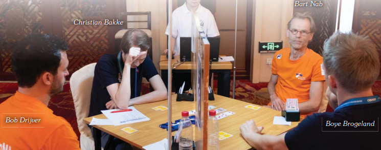 Det kom en runde hvor ikke Brogeland-Bakke sitt bord ble vist på BBO. Men man kan ikke alltid helt stole på det man ser på BBO, for ved et annet bord stod det at DeWijs-Brink spilte, og det er neppe sannsynlig at de to nederlandske parene i gullkampen har byttet makkere…